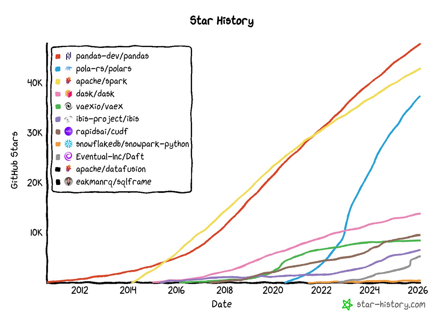 Polars expressions are column-oriented and composable. When used in lazy mode, it builds an optimized query plan similar to Spark, but executes efficiently on a single machine using multithreading. Polars has become mainstream among performance-focused data engineers. Pandas still wins on total usage, but Polars wins on performance credibility and technical momentum.